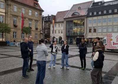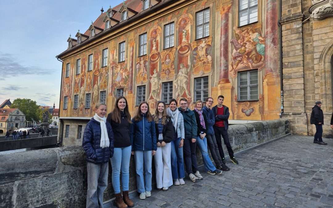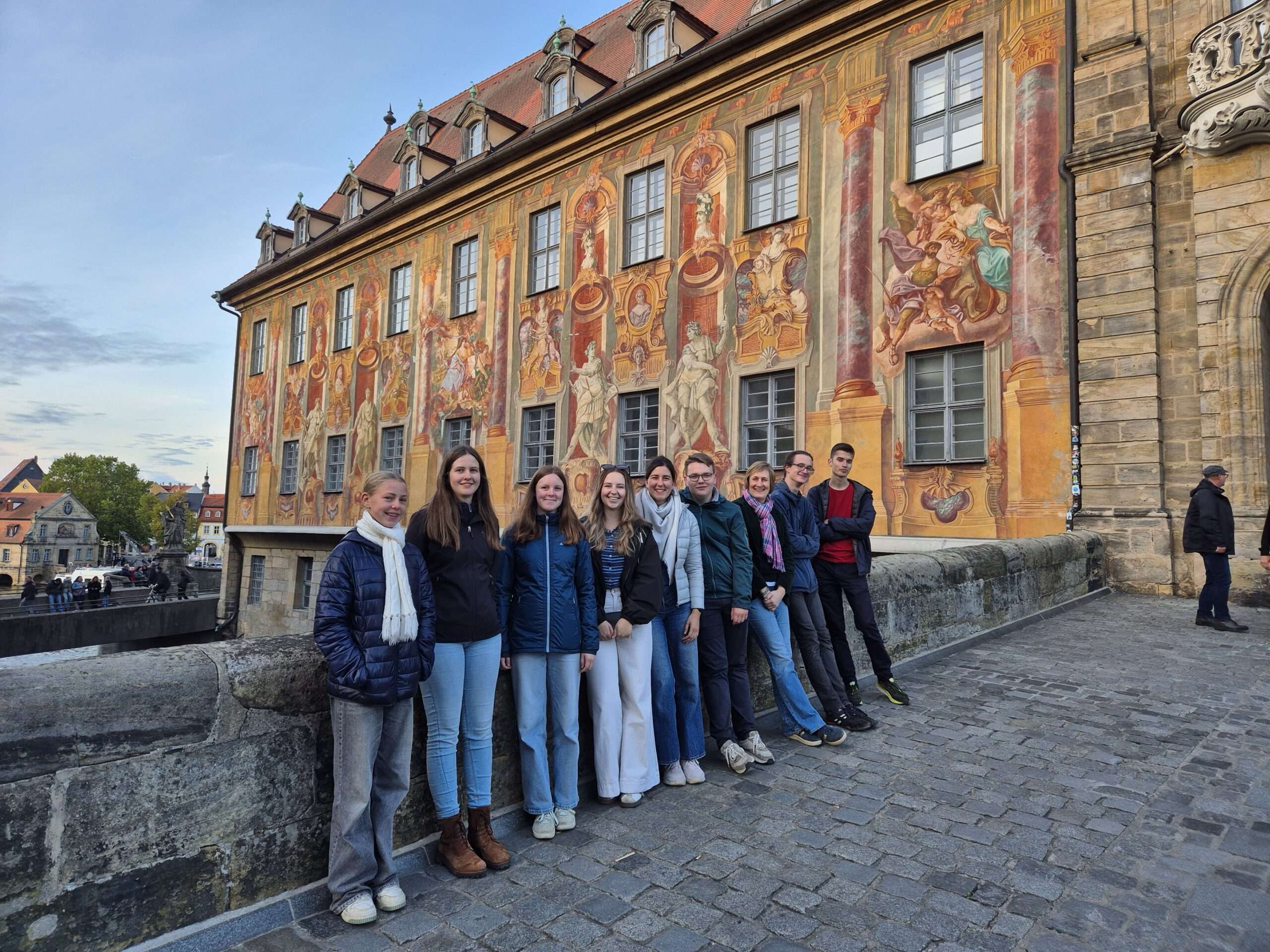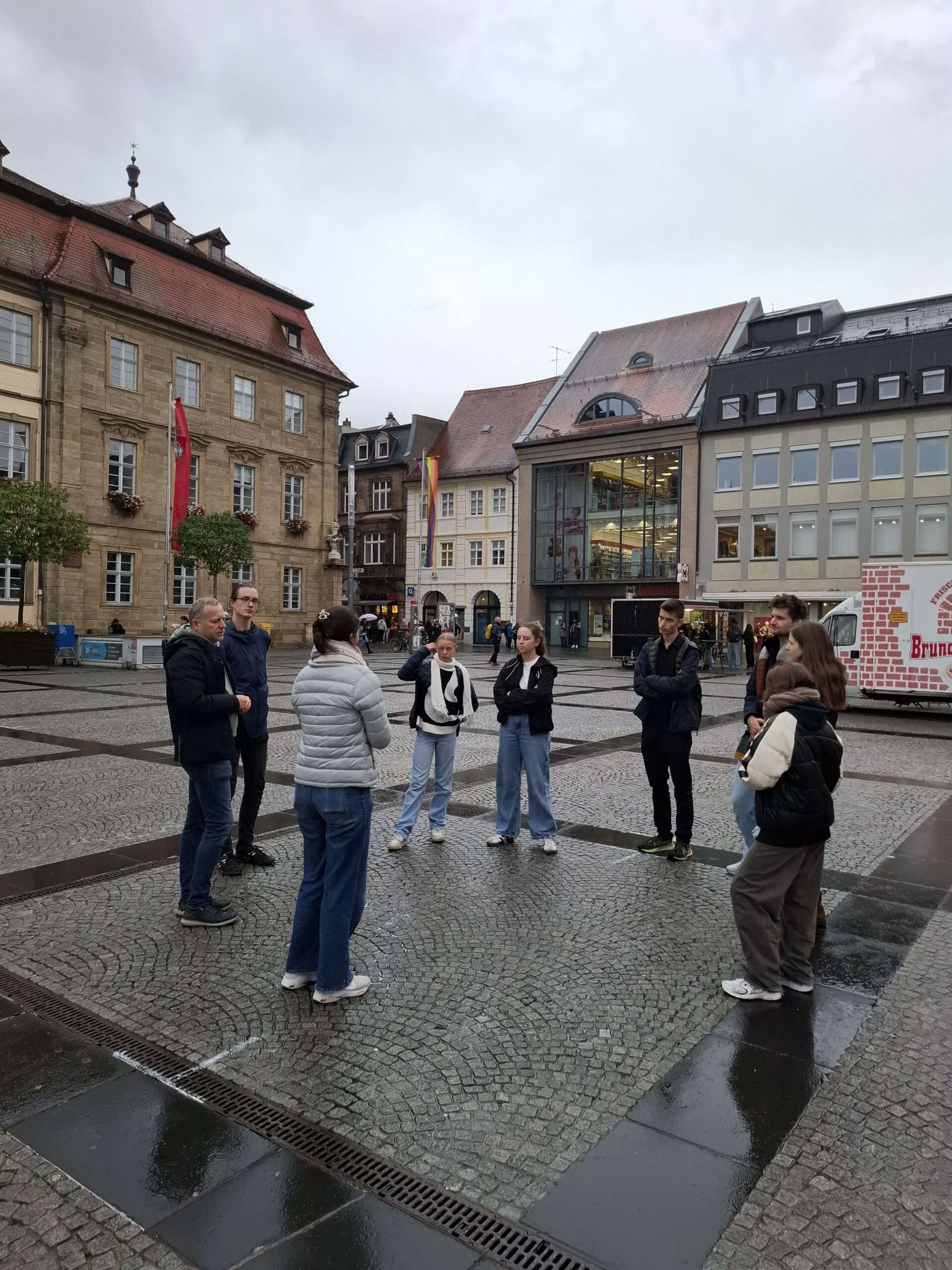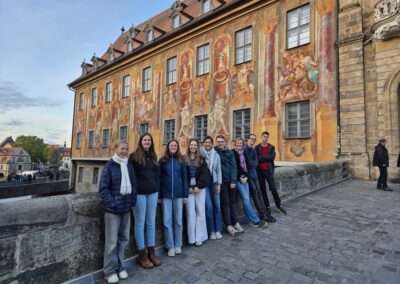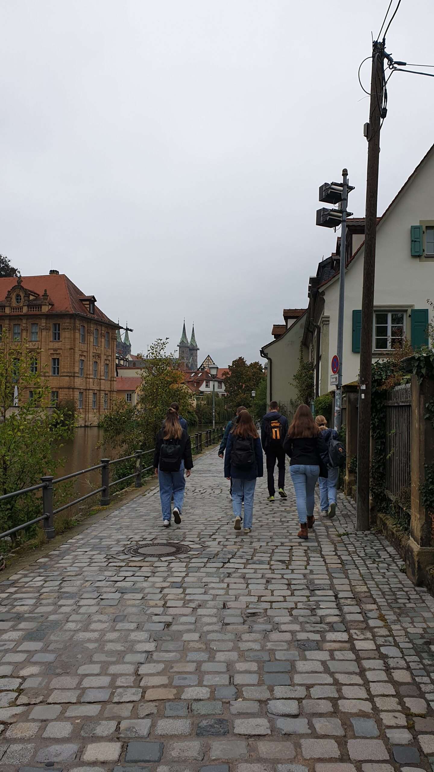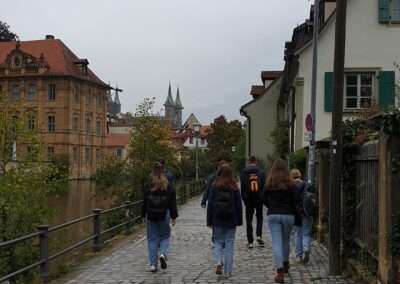 Spontan beschlossen wir anschließend, einen kurzen Stadtrundgang zu unternehmen. Zuerst besichtigten wir den Dom und den wunderschönen Rosengarten auf dem Domberg. Danach führte uns der Weg hinunter zum malerisch in die Regnitz gebauten Alten Rathaus. Dort erzählte uns unsere Jugendreferentin Anna Szinyei eine faszinierende Geschichte über Kaiser Heinrich, Kaiserin Kunigunde und den mystischen „Heiner“. Diese drei Gestalten begleiteten uns das ganze Wochenende – und werden es wohl auch darüber hinaus tun.